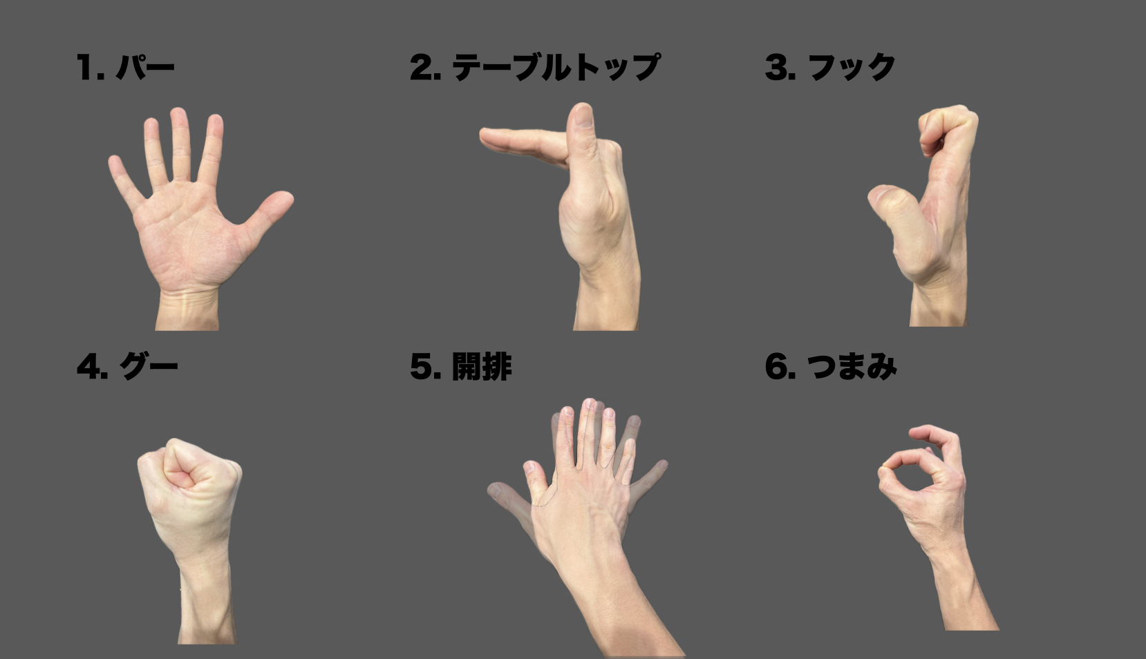 - フック(指の第二関節を曲げる) 物を引っ掛けるような形。日常生活での持ち上げ動作に直結。