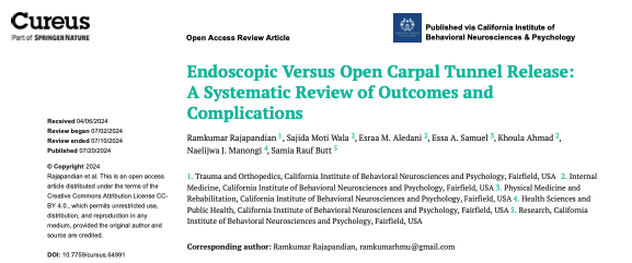 手根管症候群の手術には大きく分けて 「直視下手根管開放術(OCTR)」 と 「内視鏡手根管開放術(ECTR)」 の2種類があります。 どちらが良いのかは長年議論されてきましたが、2024年にCureus誌に掲載された最新のシステマティックレビューが、この疑問に質の高いエビデンスで答えています。