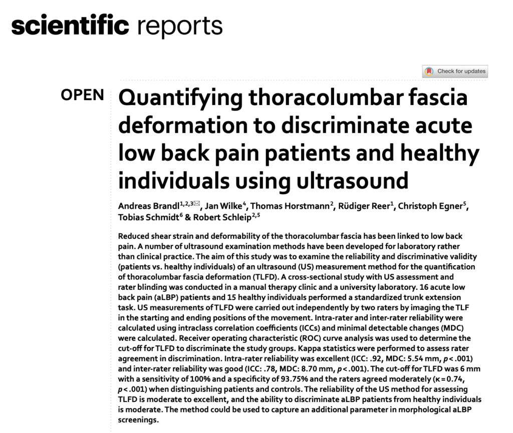 今回ご紹介するのは、胸腰筋膜(thoracolumbar fascia)という腰背部の筋膜に注目し、超音波(エコー)でその動きを測定することで、急性腰痛の患者さんと健康な人を見分けられるかを調べた論文です。