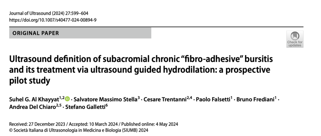 Almekinders SG ら. Ultrasound definition of subacromial chronic “fibro-adhesive” bursitis and its treatment via ultrasound guided hydrodilation: a prospective pilot study. Journal of Ultrasound. 2024.