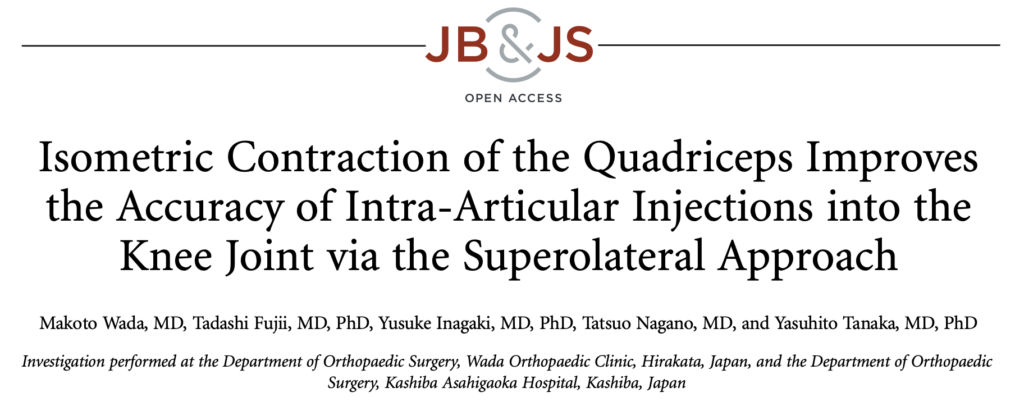今回取り上げるのは、2018年に JBJS Open Access に掲載された “Isometric Contraction of the Quadriceps Improves the Accuracy of Intra-Articular Injections into the Knee Joint via the Superolateral Approach” という論文です。この研究では、膝の関節内注射をより正確に行うために、注射時に大腿四頭筋へ等尺性収縮をかける方法が検討されました。患者さんに太ももの前の筋肉へ力を入れてもらうことで、膝蓋上包という関節上方のスペースが広がり、関節内へ正確に注射できる確率が高くなるかが調べられています。