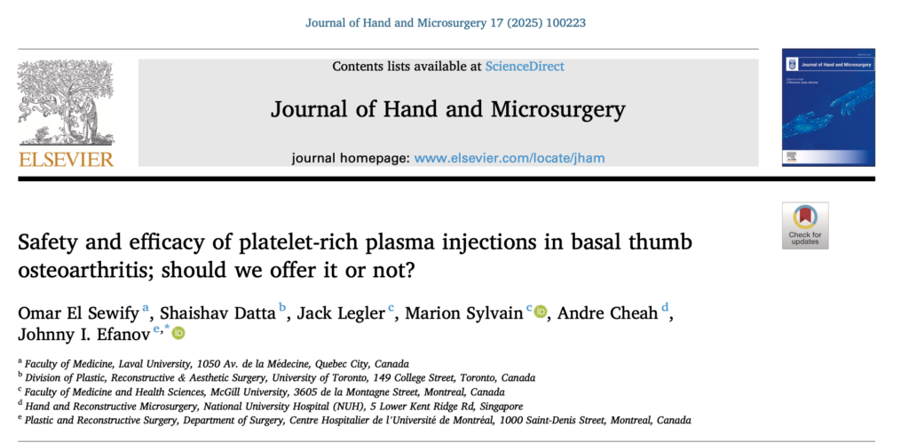 今回ご紹介する論文は、2025年にJournal of Hand and Microsurgeryに掲載された「Safety and efficacy of platelet-rich plasma injections in basal thumb osteoarthritis; should we offer it or not?」という論文です。母指CM関節症に対するPRP注射の安全性と有効性を検討したシステマティックレビュー・メタ解析です。
